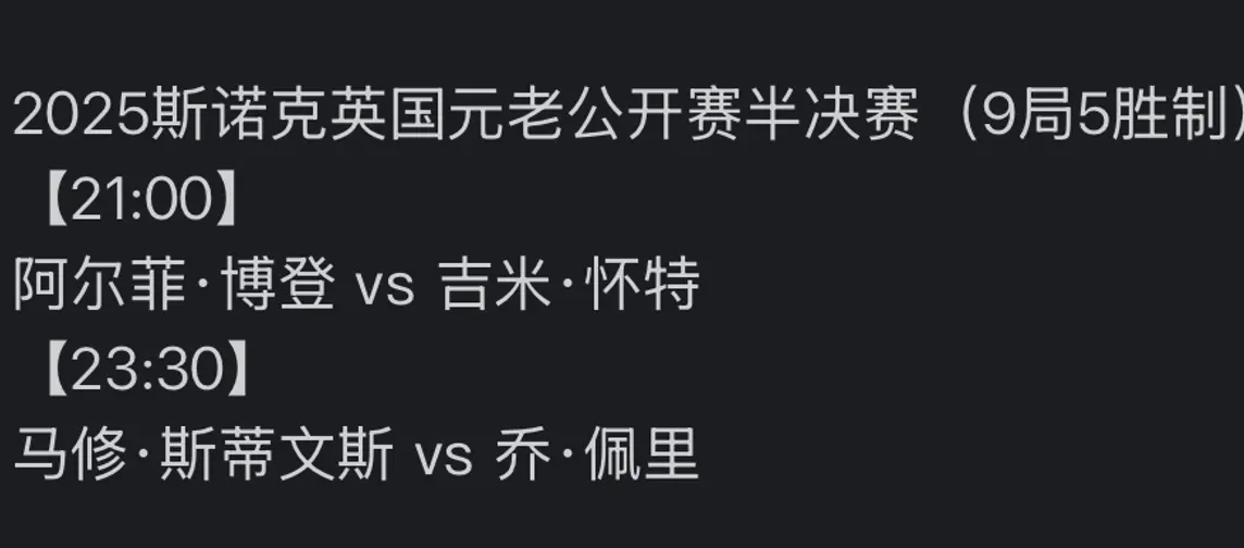本届元老赛第一轮为7局4胜制的比赛,宾汉姆跟乔佩里的较量泉源末端。乔佩里现年51岁,跟七五三杰是同庚齿段的球员,得回过2次排行赛冠军,差别为PTC总决赛跟威尔士公开赛,辞世锦赛中最佳收成为4强,还拿到过专家赛亚军。