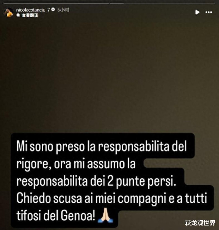 斯坦丘自从旧年加盟热那亚以来,在各项赛事中第7次出场,此前斯坦丘曾介怀大利杯的比赛里打进一球。但介怀甲联赛,斯坦丘一直莫得斩获进球。这个点球罚丢,他遇到了网暴,赛后他在社媒发文说念歉:“我承担了点球的职守,承担丢掉这2分的职守。我向队友和统共热那亚球迷说念歉。”