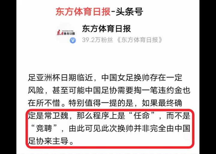 媒体东谈主传常卫魏无尽接近女足国度队主教练。